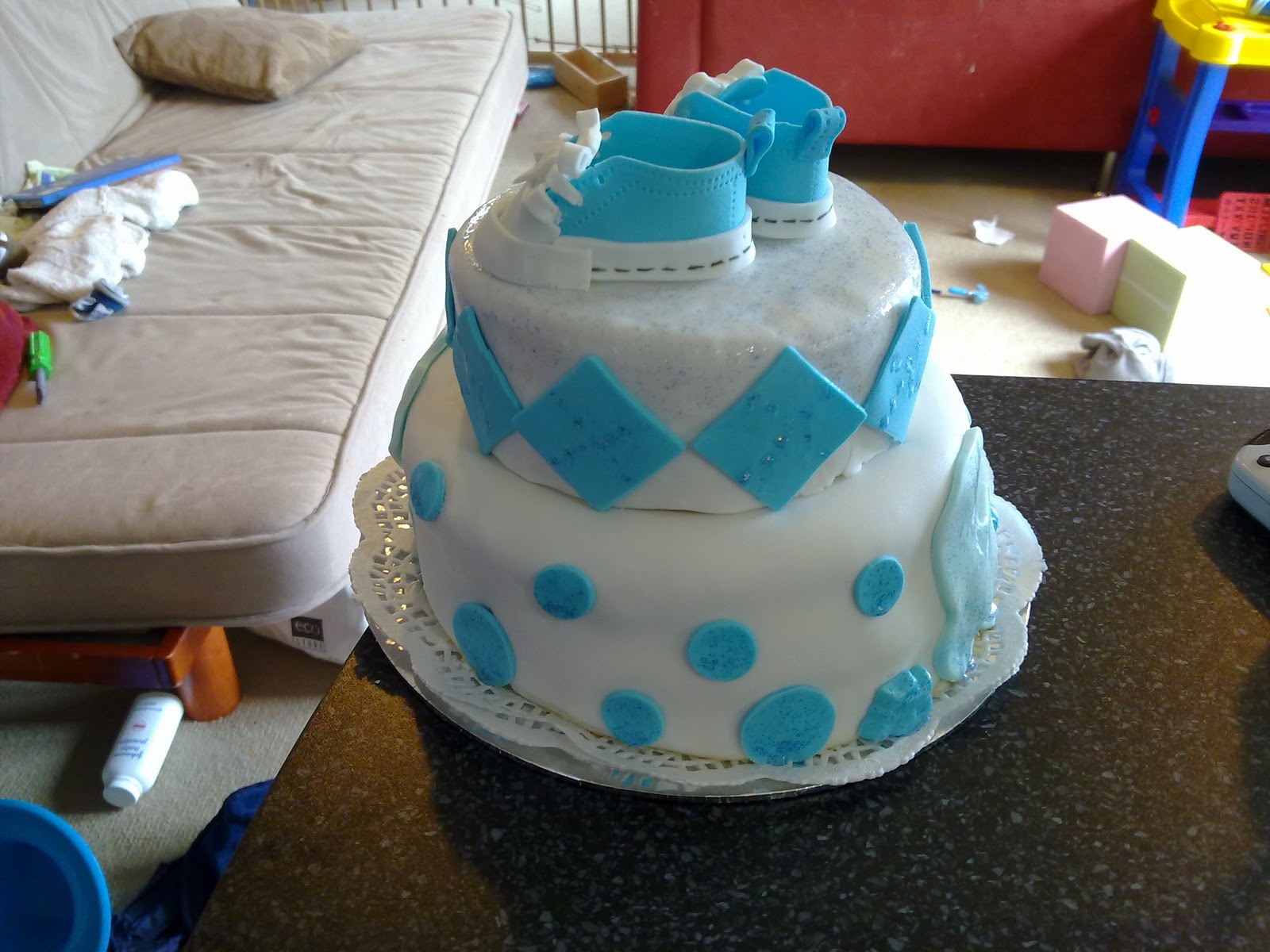 I made the shoes and the rest of the decorations with fondant. I then "painted" them and the top of the cake with a mix of blue and silver glitters.